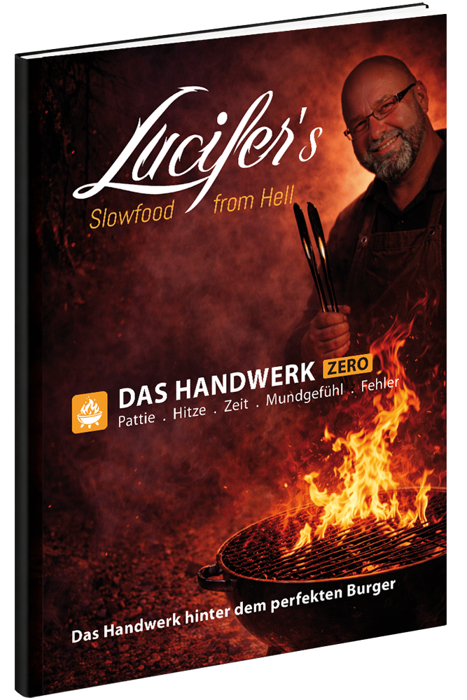 LUCIFER’s SLOWFOOD – ZERO ist kein Rezeptbuch, sondern ein Handbuch für Burger-Handwerk. Hier geht es nicht um Schritt-für-Schritt-Anleitungen, sondern um Zusammenhänge, Prinzipien und Entscheidungen. ZERO erklärt, warum Burger funktionieren – und warum sie scheitern. Fleisch, Pattie, Hitze, Zeit, Käse, Sauce und Aufbau werden nicht isoliert betrachtet, sondern als zusammenhängendes System.